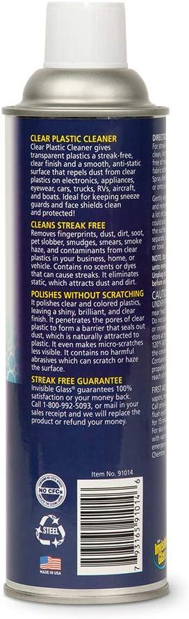 PROTECTS AND CLEANS: Invisible Glass Clear Plastic Cleaner gives transparent plastics a streak-free, clear finish and a smooth, anti-static surface that repels dust from clear plastics on electronics, appliances, eyewear, cars, trucks, RVs, aircraft, and boats. Ideal for keeping sneeze guards and face shields clean and protected!