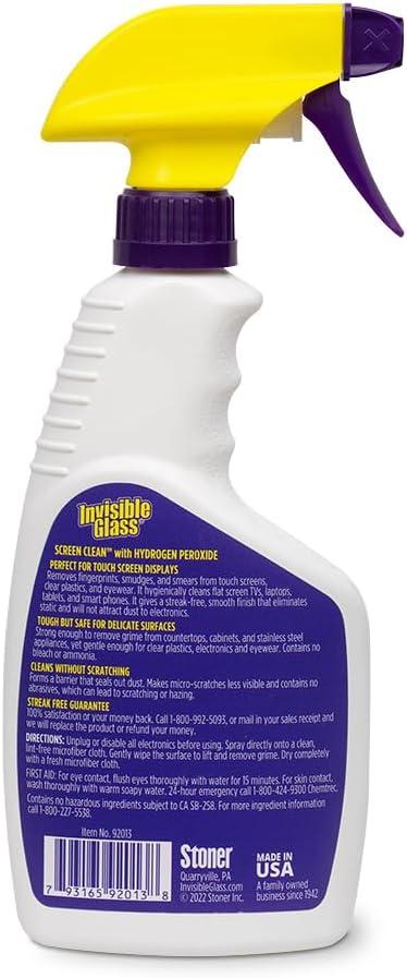 Invisible Glass Screen Clean Multi-Surface Cleaner with Hydrogen Peroxide provides a powerful, all-in-one cleaning solution for a wide range of surfaces like smartphones, tablets, laptops, TVs, and monitors, as well as non-electronic surfaces such as countertops, mirrors, windows, and stainless steel appliances. It is gentle enough for delicate items and strong enough for tough grime on harder surfaces. Screen Clean actively repels dust, reduces static buildup, and minimizes the appearance of micro-scratches on electronics, helping devices look newer for longer. Additionally, it defends against fingerprints and smudges, removing them and creating a protective layer to resist future marks, maintaining a crystal-clear shine. Screen Clean contains no bleach, ammonia, soaps, dyes, or scents, ensuring a residue-free, streak-free finish every time. Proudly made in the USA with high-quality ingredients, Invisible Glass is crafted for unmatched performance and reliability.