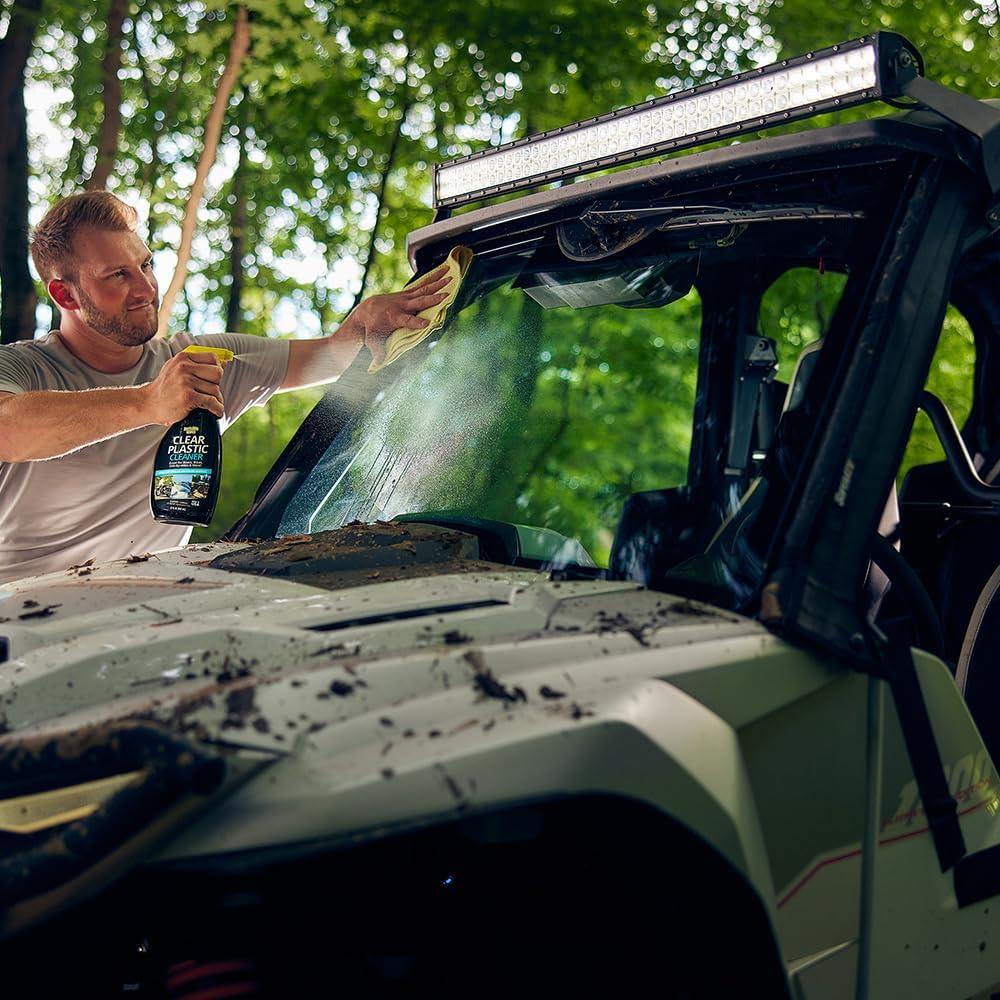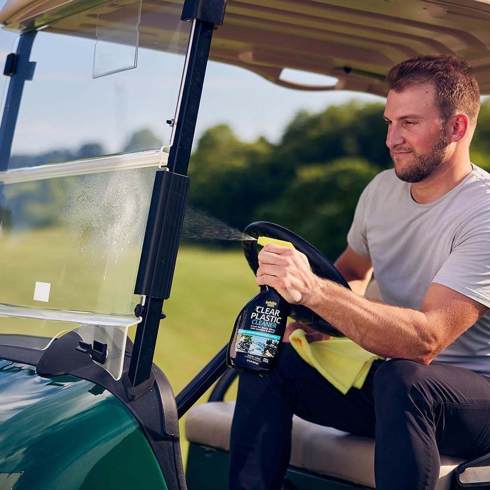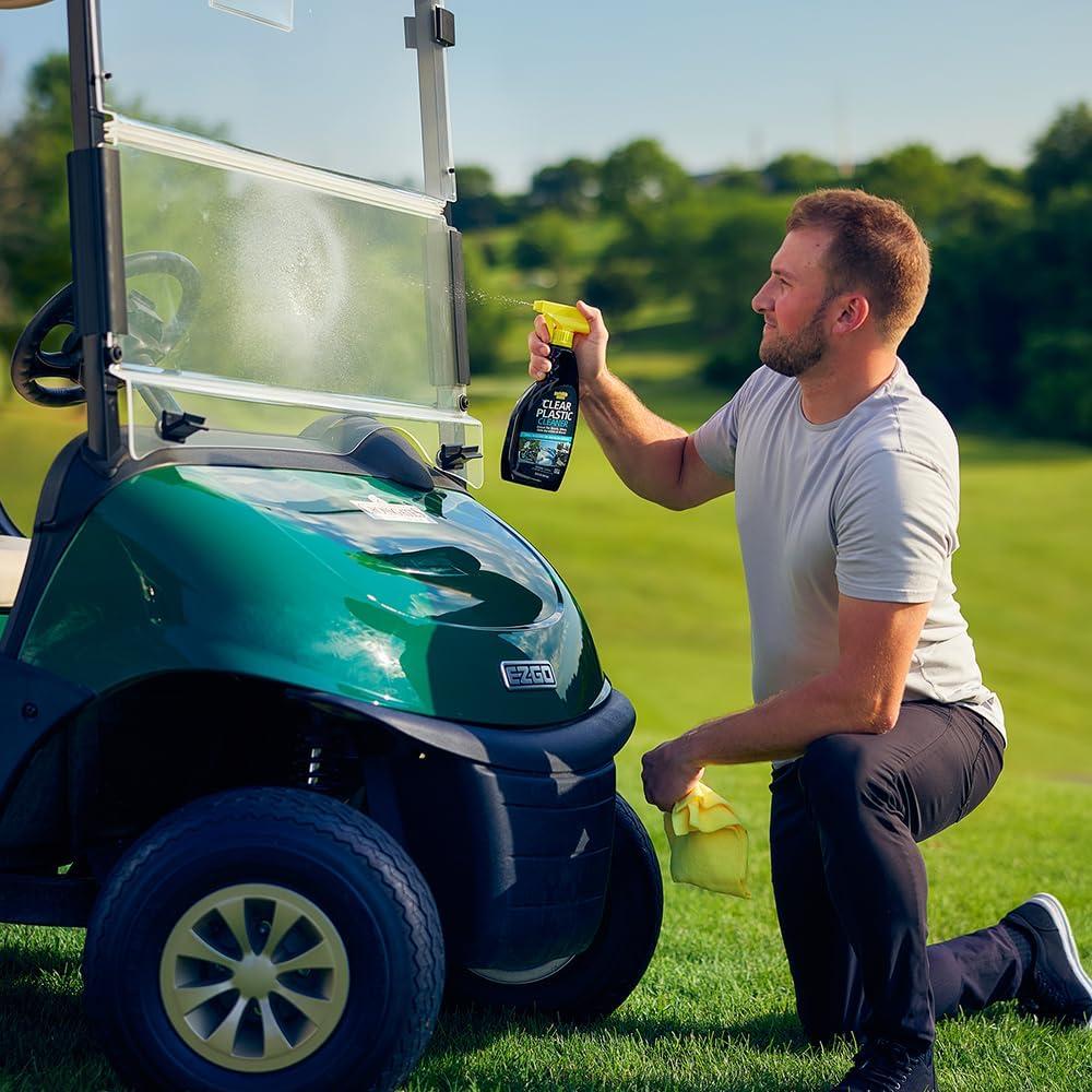 PLASTIC SURFACE CLEANER: Safely cleans acrylic and vinyl windows, windshields, helmet visors, and more. Leaves no streaks or haze on any clear plastic surface, including aircraft windows, soft-top windows, golf cart windshields, and more.